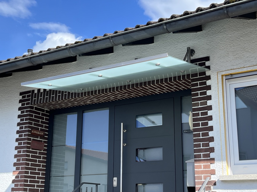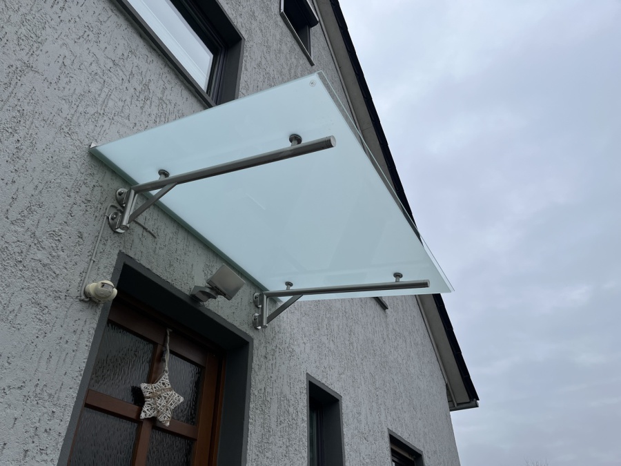 Vordach mit 12mm TVG-Glasscheibe mit matte Folie (Milchglas) 1880x1000mm und 3x Rundrohrkonsole, Knaggenversteifung mit Rundlochung