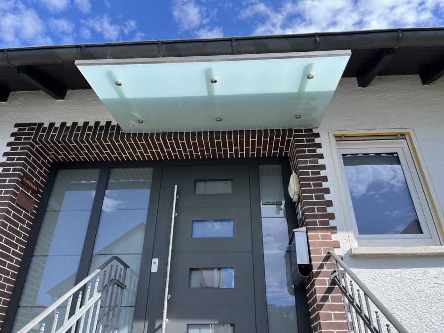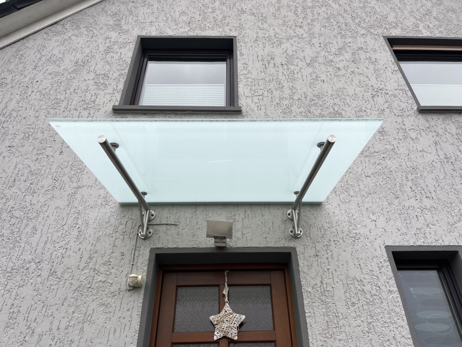 Vordach in der Größe 1880x1000mm aus 12mm TVG-Glas mit matte Folie (Milchglas) mit Wasserrinne und Abfluss integriert im Geländerpfosten