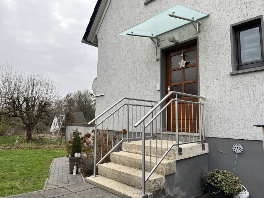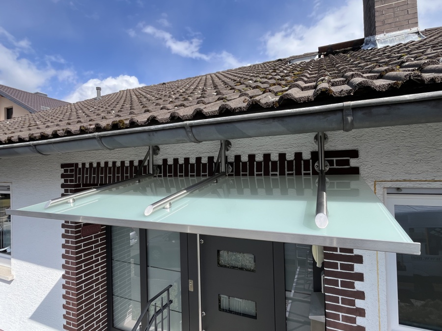 Edelstahl-Vordach mit Rundrohrkonsole und vorderseitiger Rinnen mit Abflussrohranschluss
