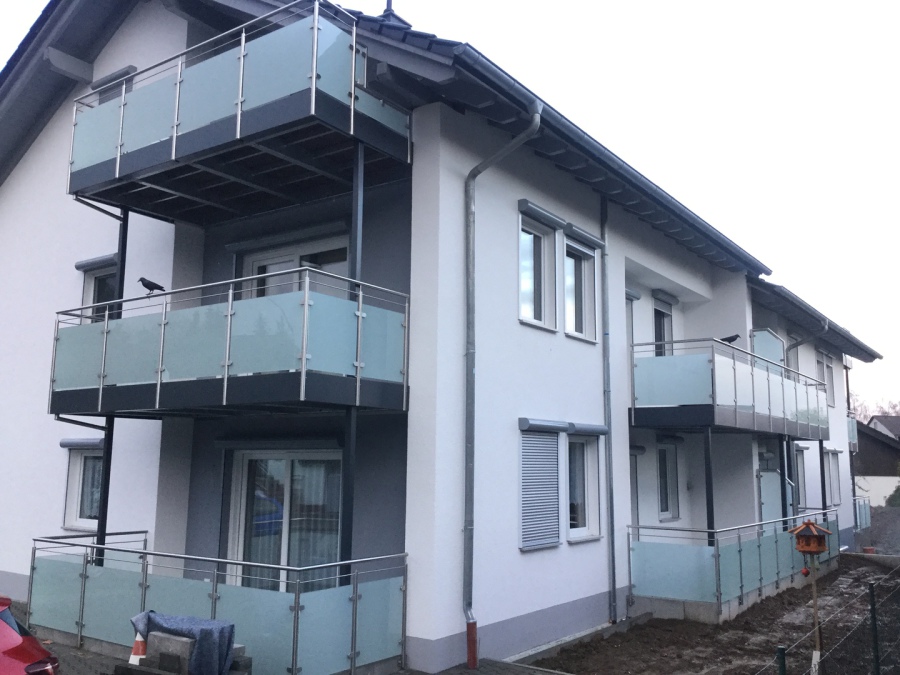 Außengeländer Füllung aus VSG-Glas mit matte Folie (Milchglas) und verkröpften Pfosten, Befestigung von Unten