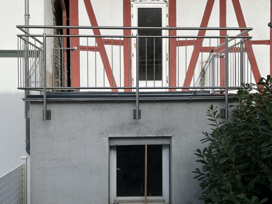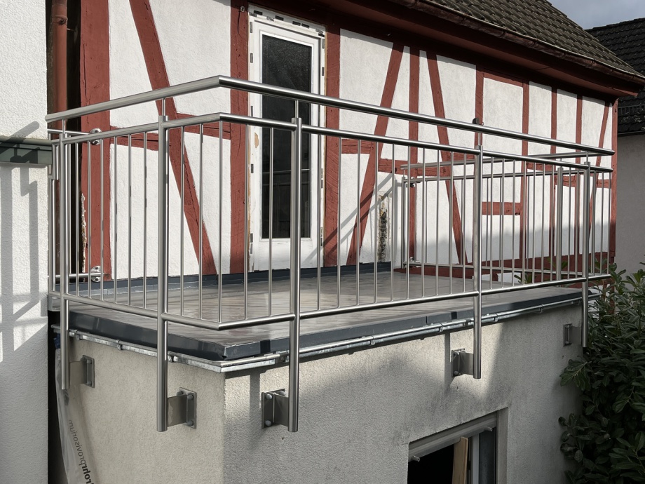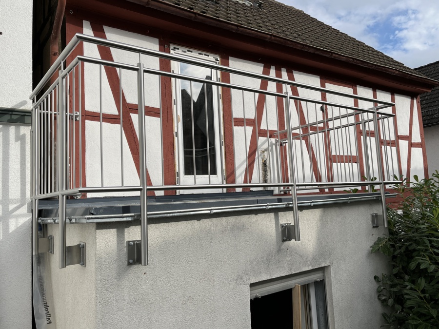 Balkon Geländer mit Ober- und Untergurt, senkrechten Füllstäben und aufgesetzem Handlauf komplett durchgehend geschweißt in Edelstahl