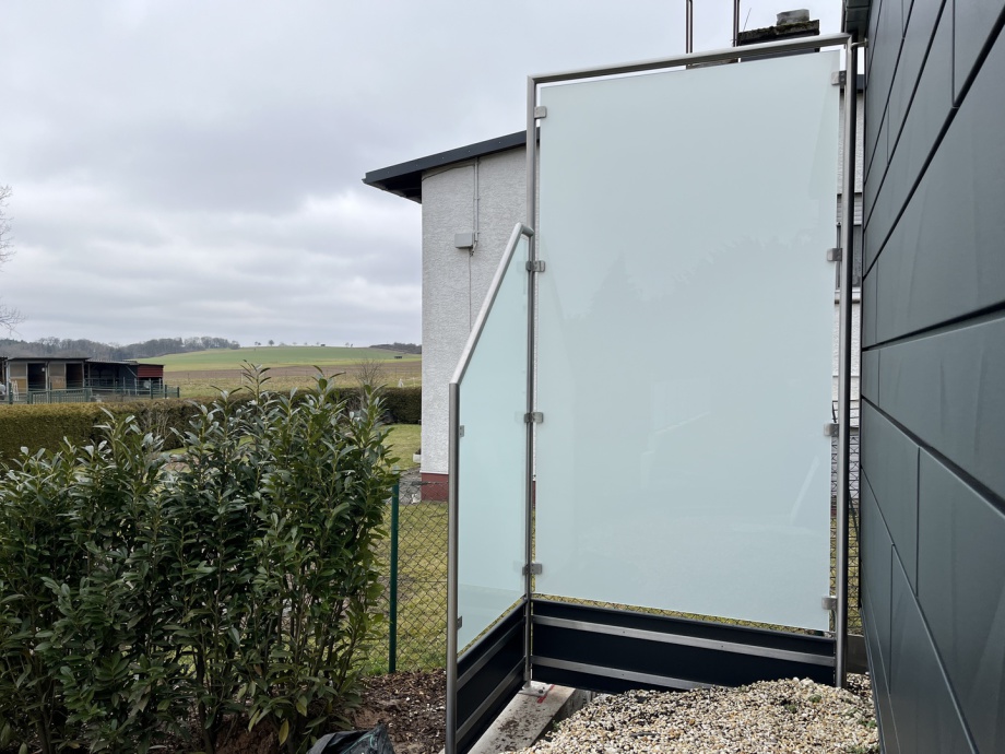 Sichtschutz mit 45° Schräge und Glasfüllung in VSG mit matte Folie (Milchglas)
