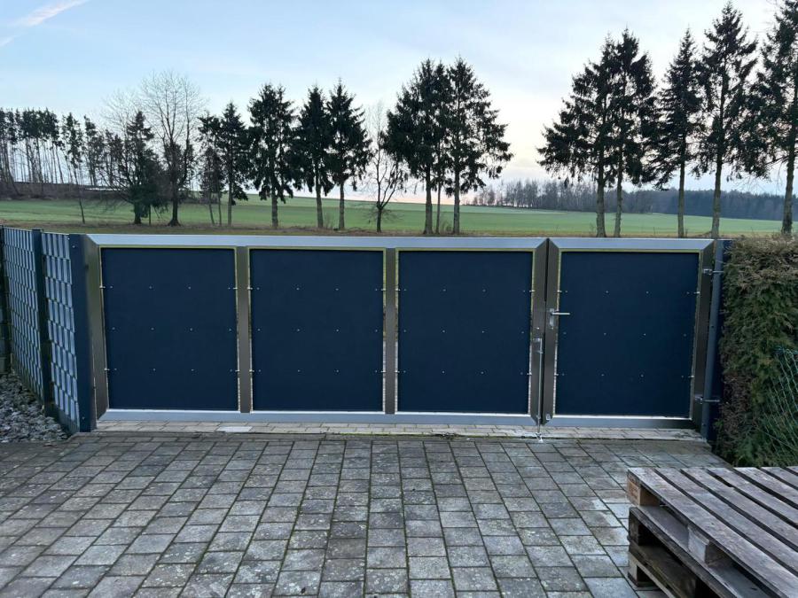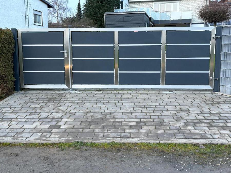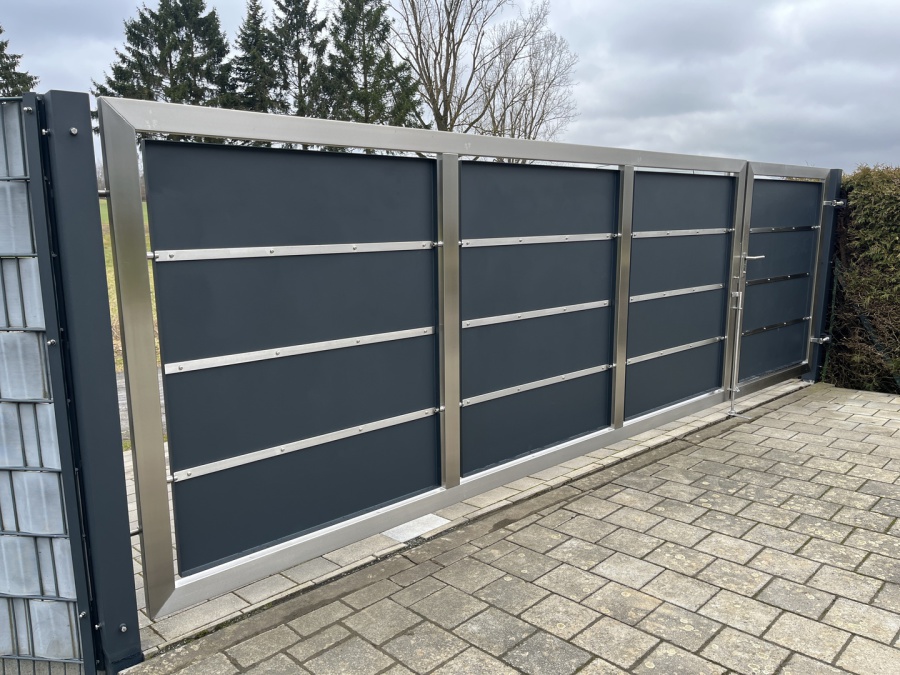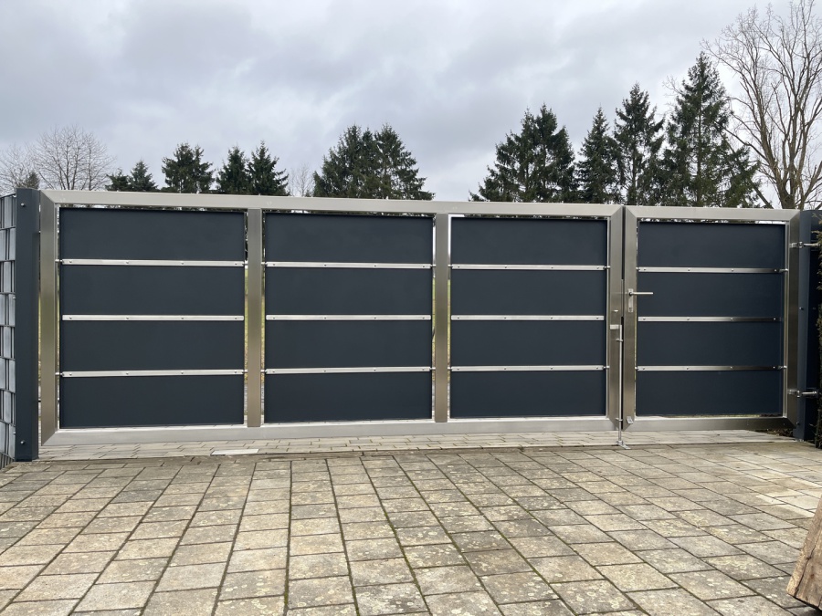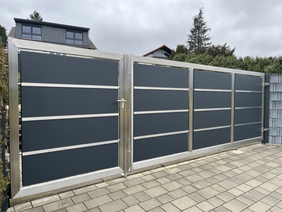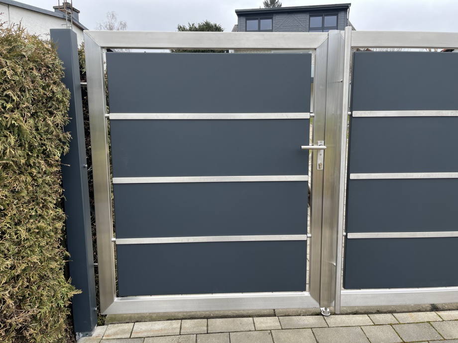 Edelstahl-Drehtor mit Türchen, Blechfüllung in RAL 7016 Feinstruktur mit horizontalen Blechstreifen