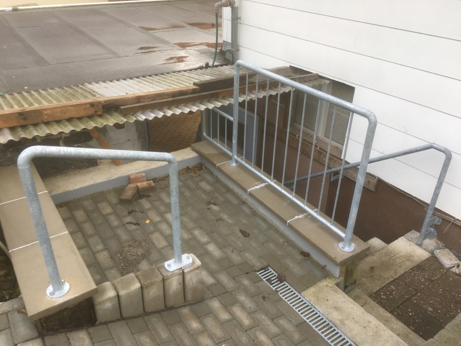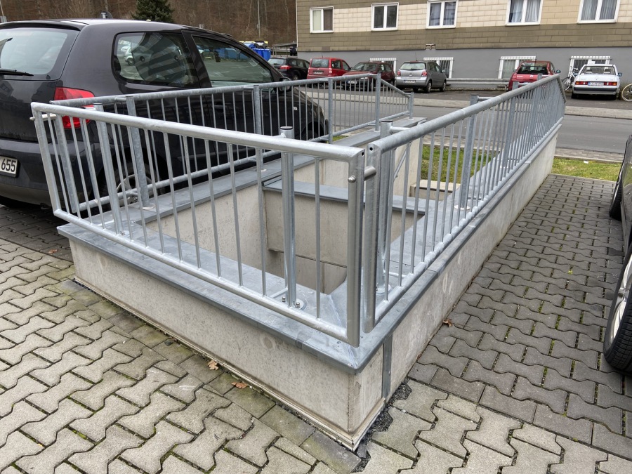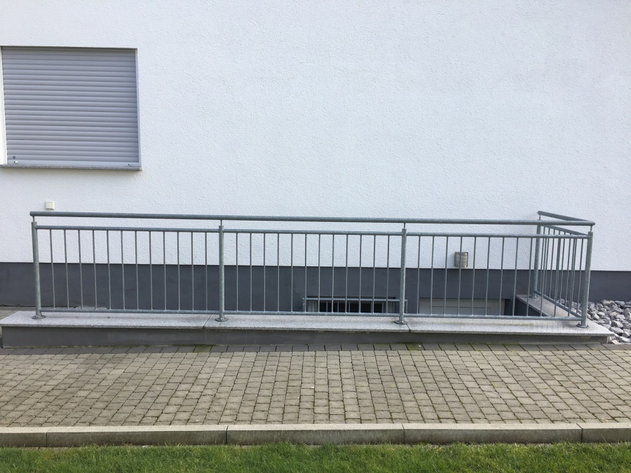 Feuerverzinktes Geländer mit senkrechten Füllstäben an einem Kellerabgang