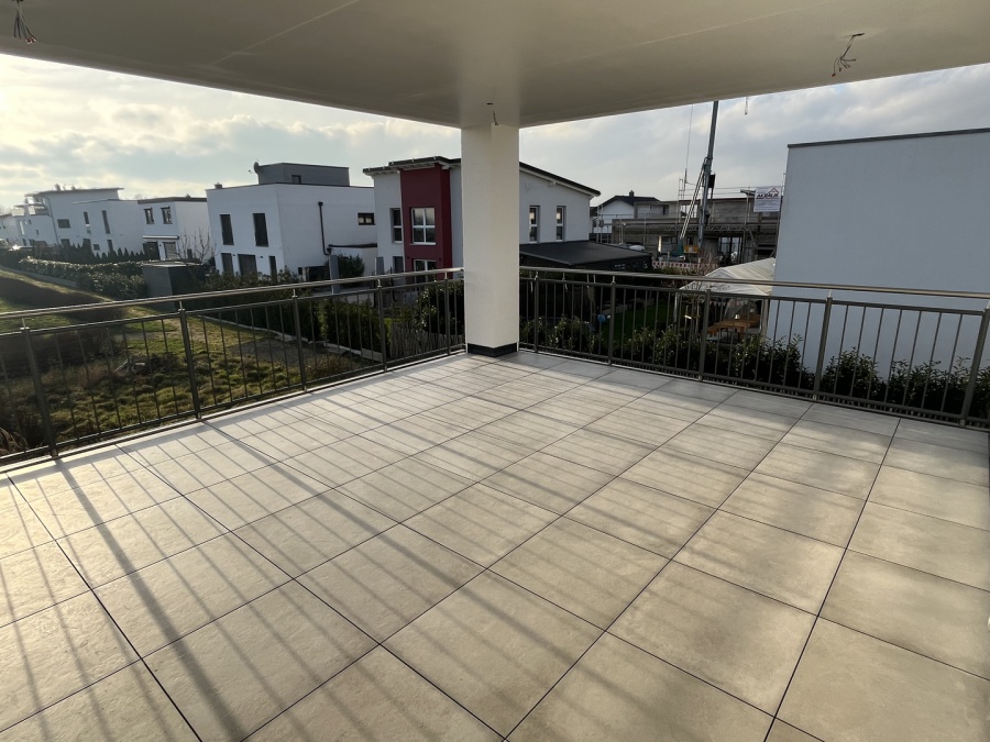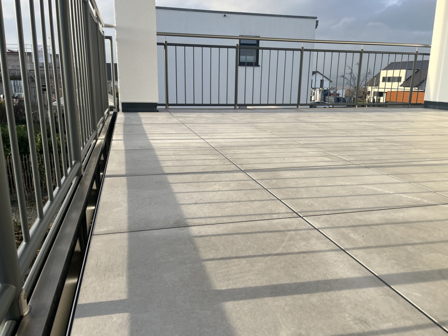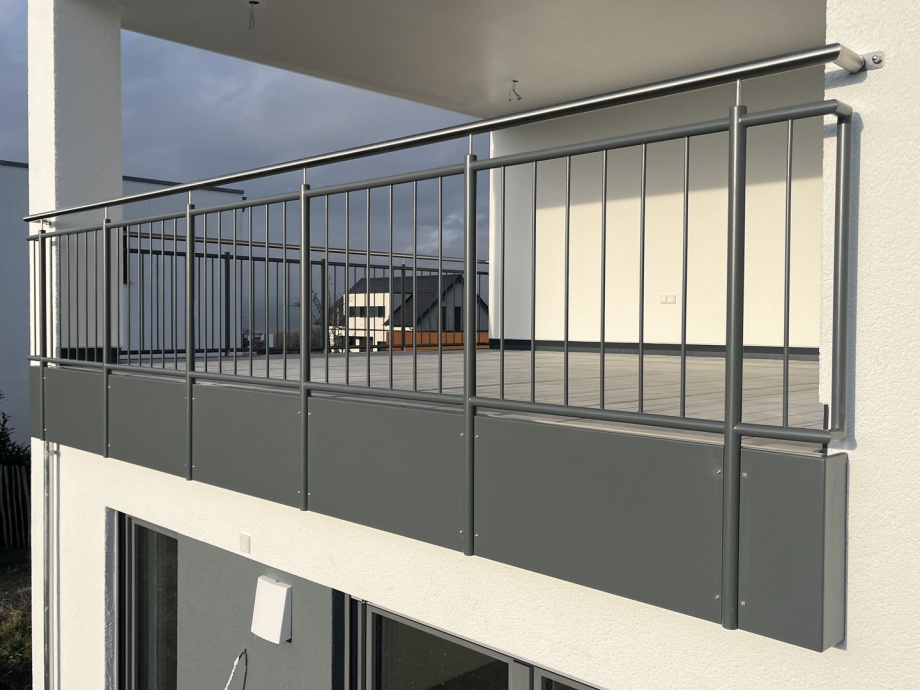 Stahl Balkon Geländer in 4-Kant Ausführung mit nach innen versetzter Füllung und handlauf, komplett pulverbeschichtet in DB 703 Feinstruktur