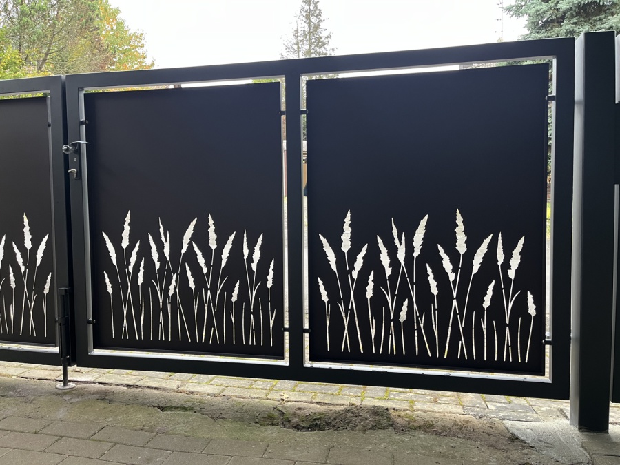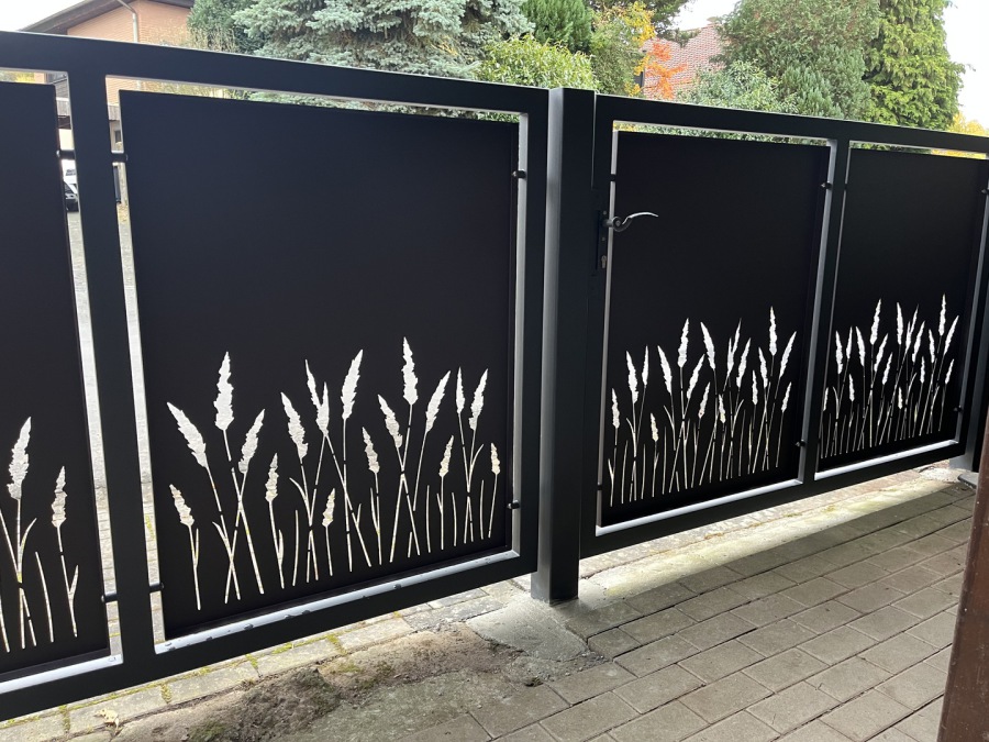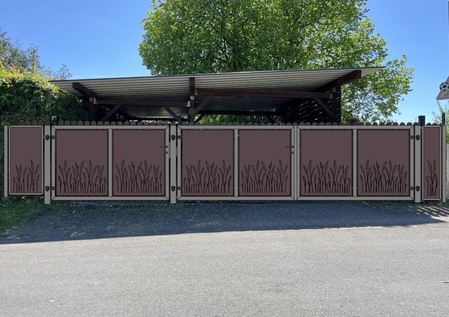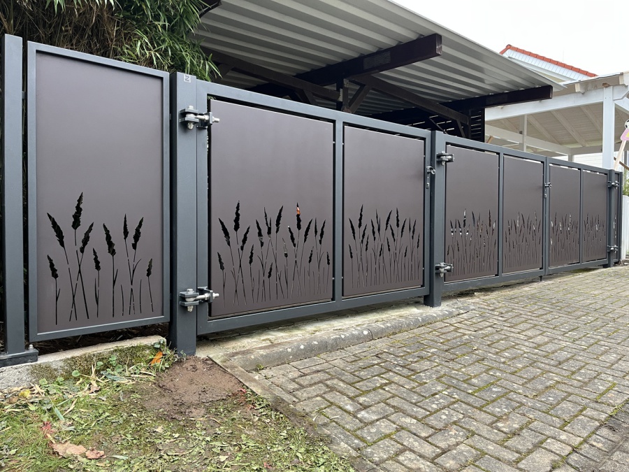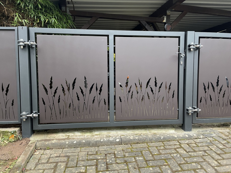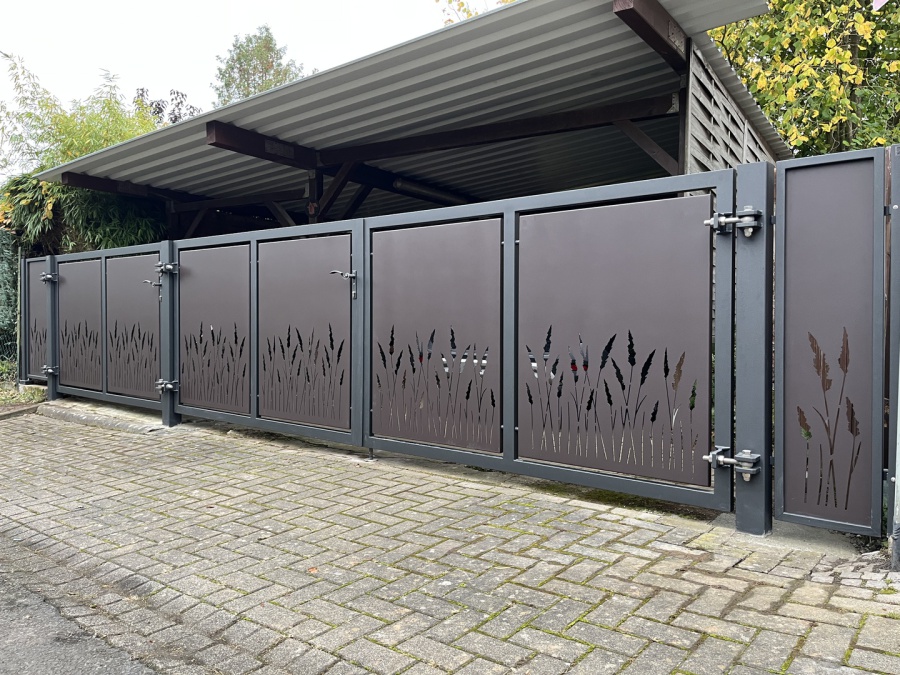 Drehtor und Türchen in Stahl, Verzinkt und pulverbeschichtet in RAL 9007 Feinstruktur, Kassettenbleche in Alu 3mm,