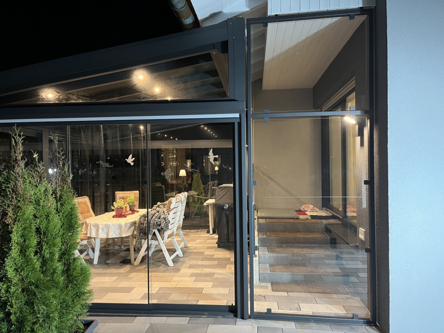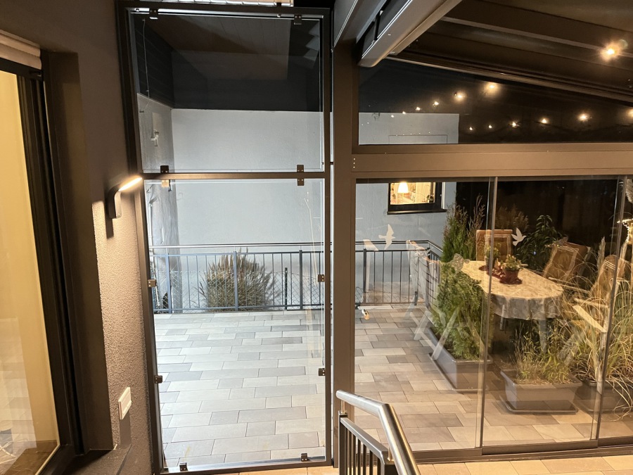 Windfang mit 10mm VSG Scheibe in klar, Befestigung des Glases mit Glasklemmhalterungen, pulverbeschichtet in Marrone Feisntruktur