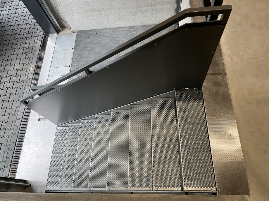 Stahl-Wangentreppe aus Fl 200x10mm mit Alu Riffelblechstufen komplett pulverbeschichtet in DB 703 Feinstruktur