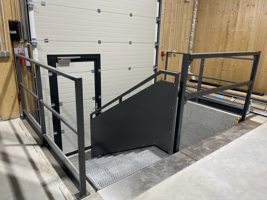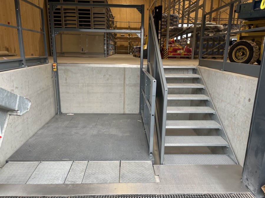 Industrie-Stahltreppe mit Flachstahlwange in 200x10 beige lackiert, Gitterroststufen mit Antrittskante feuerverzinkt und Geländer mit Kniegurt schwarz lackiert