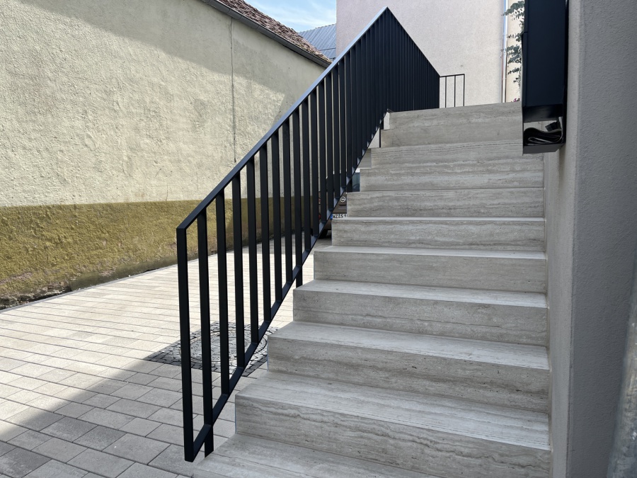 Rundrohr-Geländer mit Ober- und Untergurt, sowie senkrechten Füllstäben in Stahl-feuerverzinkt und pulverbeschichtet in RAL 7016 Feinstruktur